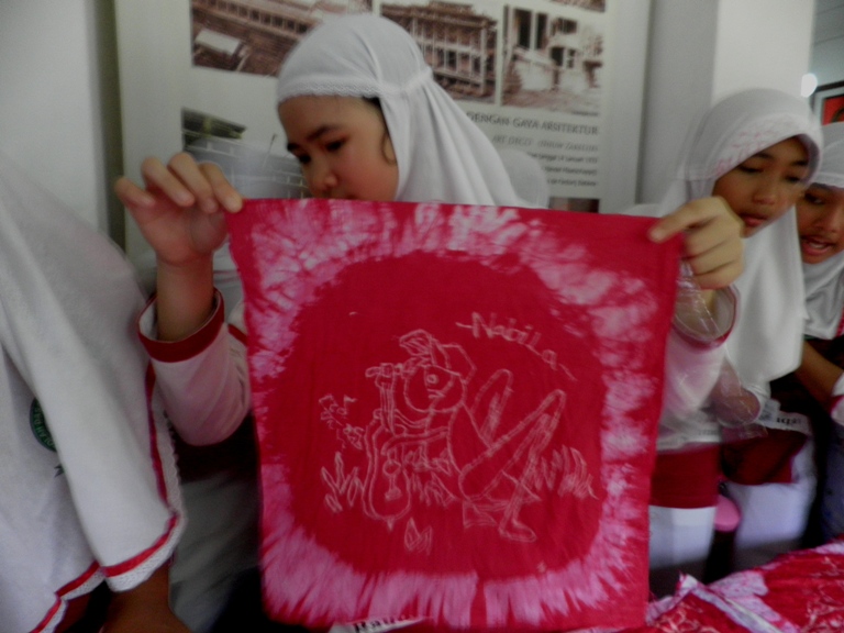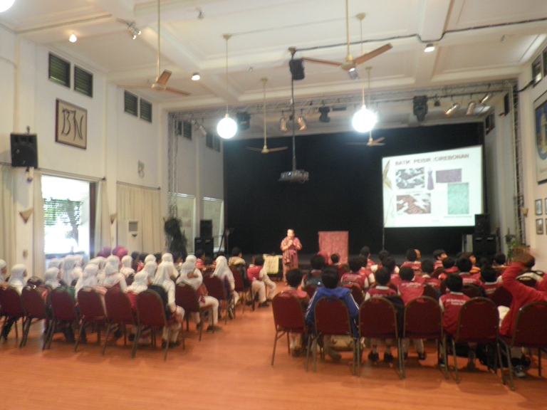 Mrs. Indra Tj shows the students how to use the ‘Mega Mendung’ (cloud) correctly (actually should be horizontal). Mega Mendung originally came from Cirebon – West Java. Cirebon is located in the North Coastal area too.