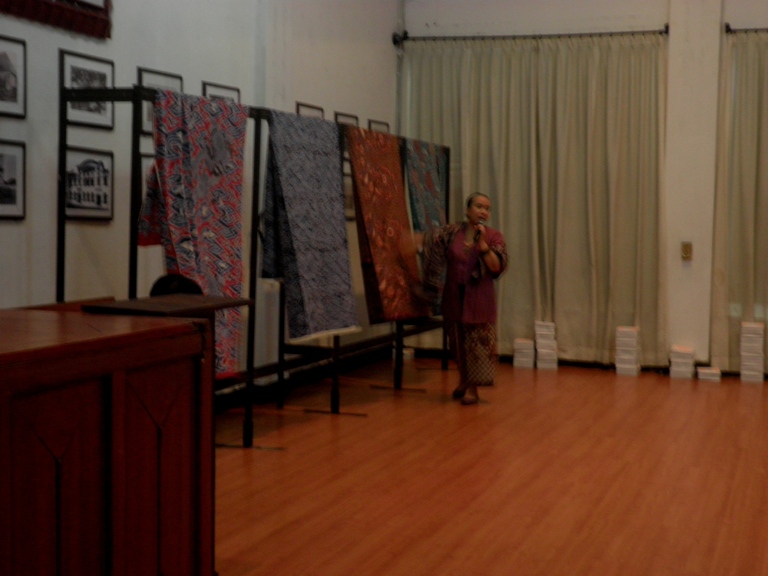 Mrs Indra Tj, Mbatik Yuuuk motivator wearing Lasem (Rembang Region-Central Jawa) ‘Kain Panjang’ with ‘Kawung’ (Palm fruit) pattern and a big scarf of ‘Gedog’ from Tuban (East Jawa) with Hong (Peacock bird) pattern.