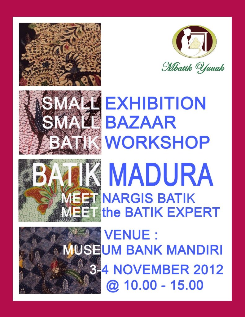 BATIK MADURA DULU & SEKARANG – 3 & 4 NOVEMBER 2012 @ MUSEUM BANK MANDIRI-KOTA TUA DO NOT MISS IT OUR NOVEMBER 2012 EVENT SMALL EXHIBITION – SMALL BAZAAR – WORKSHOP & MEET THE BATIK MADURA EXPERT Share this: Click to share on Facebook (Opens in new window) Facebook Click to share on X (Opens in new window) X Click to share on LinkedIn (Opens in new window) LinkedIn Like Loading... Related
