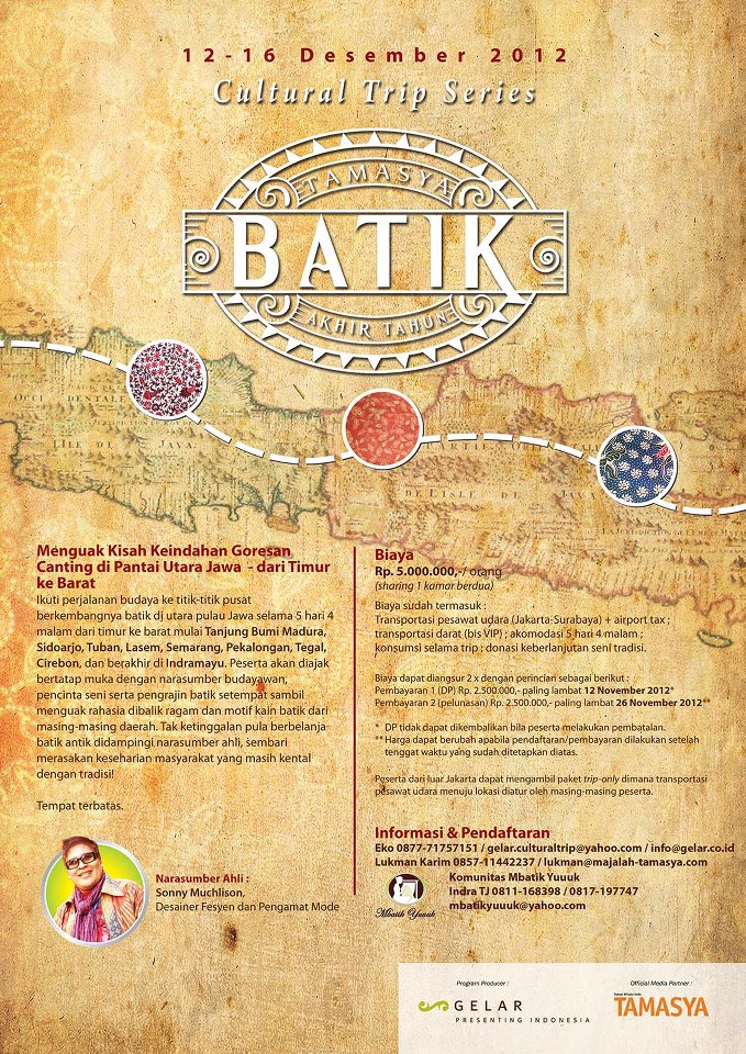 FULL BOARD Rp 5.000.000 – twin share, Garuda to Surabaya includes airport tax, private travel bus, hotels, meals, expert/source in Batik Fashion, and donation to some cultural places.