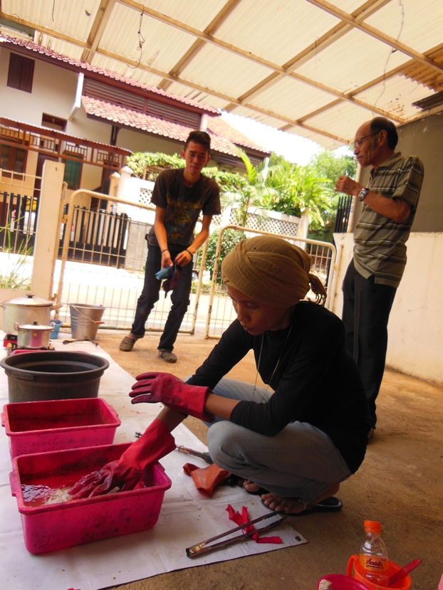 start to write using Canting as a pen and ‘malam’ (wax) as an ink, if you not ready to write the big ‘mori’ (special fabric for Batik) you may start with the small size, until you feel comfortable with your canting.