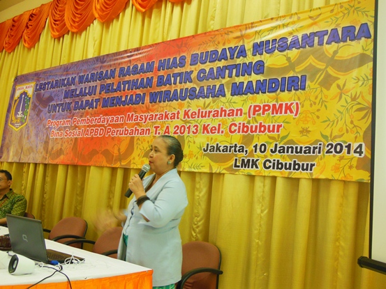 HARI PERTAMA : Ibu Lurah Cibubur, Budy Hartati beserta Jajaran LMK Kel Cibubur dan bu Indra pemrakarsa kegiatan PELESTARIAN WARISAN BUDAYA, melalui BATIK CANTING
