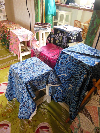 Batik Cirebon in blue color : Wadasan pattern (infront) and Mega Mendung pattern (in the back)