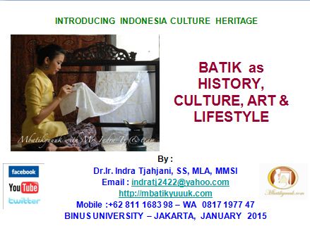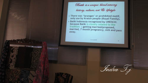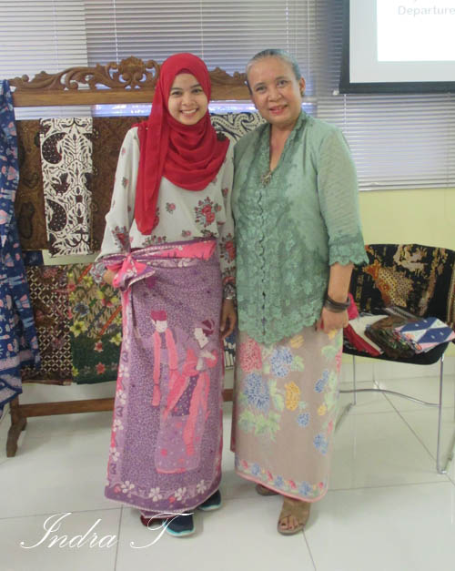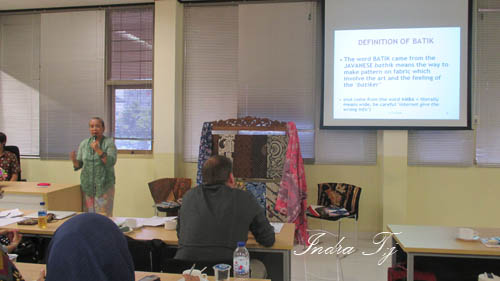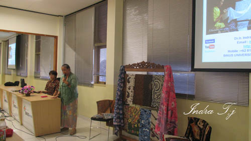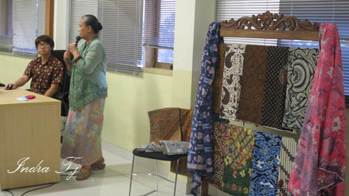 In this event DR.Ir.Indra Tjahjani, SS, MLA, MMSI introducing Indonesian traditional method in making pattern in fabric using wax.