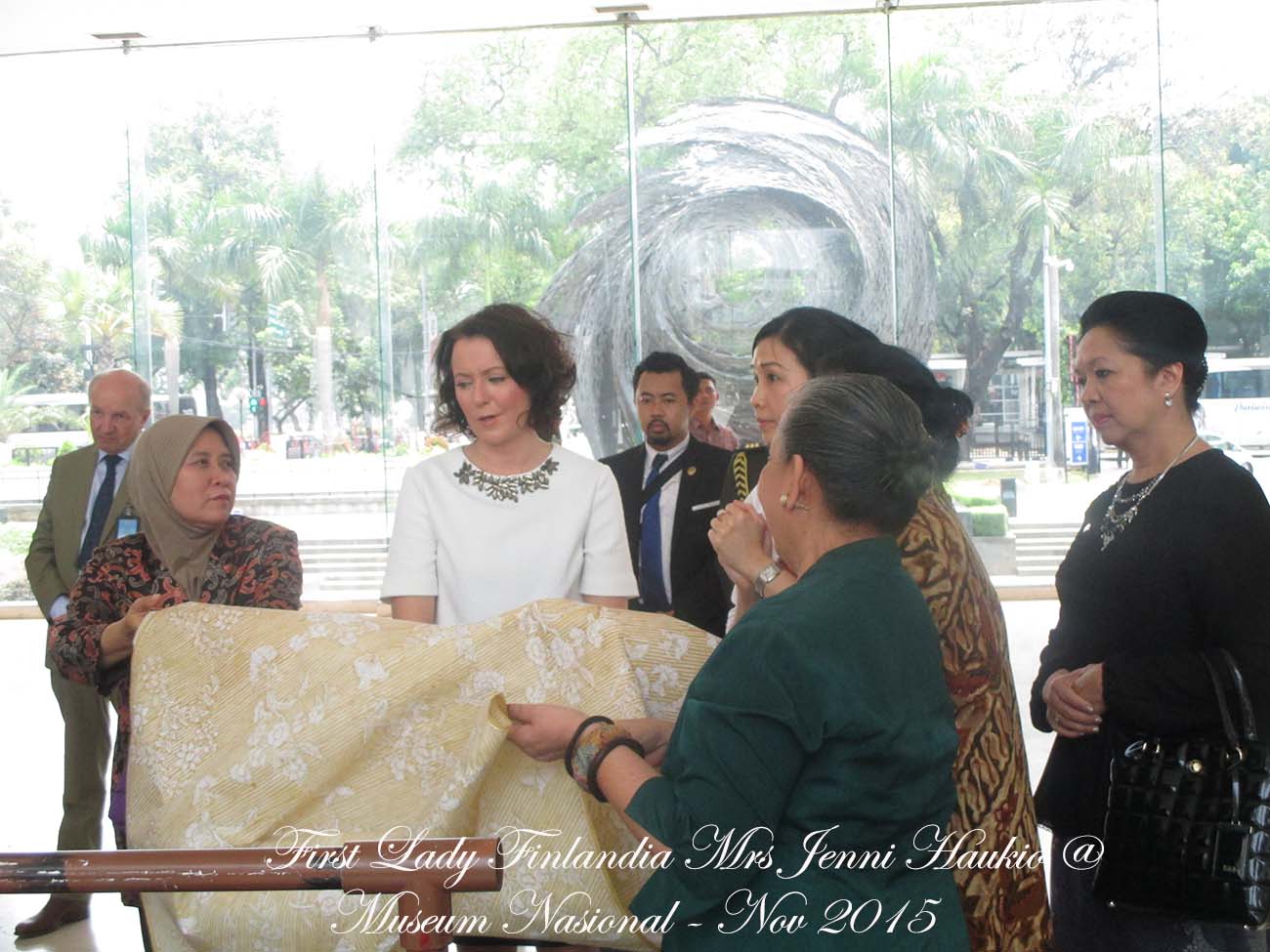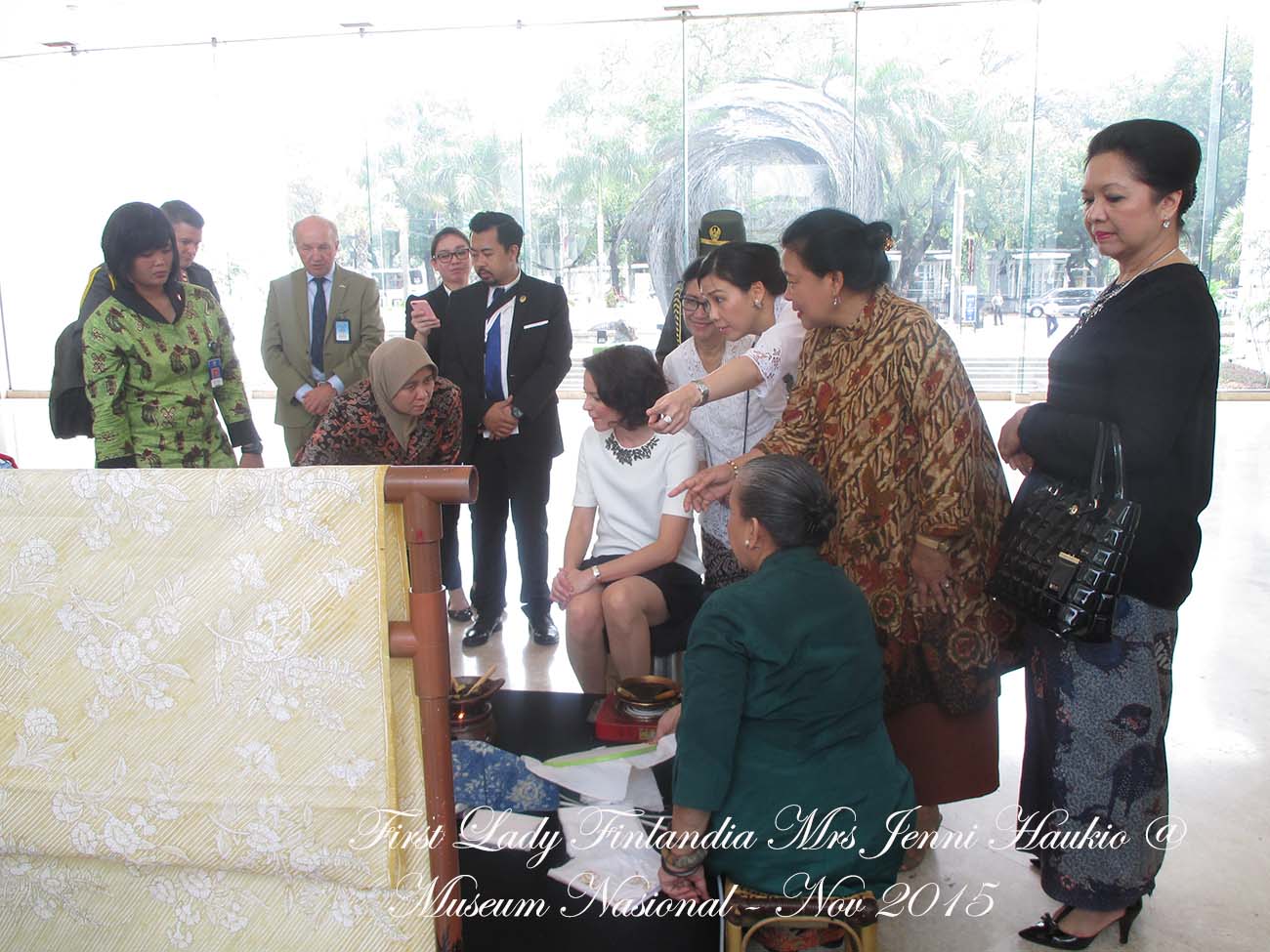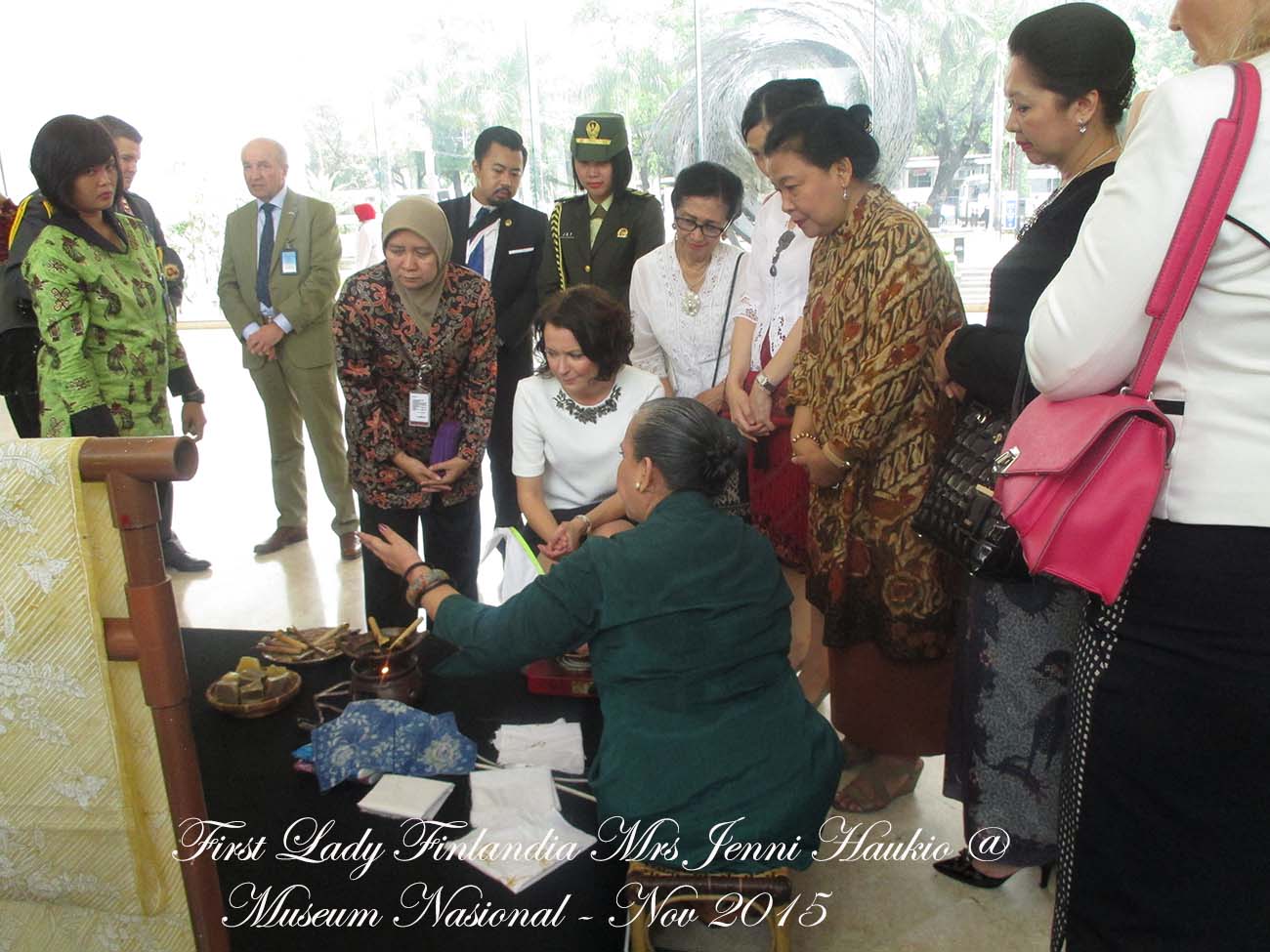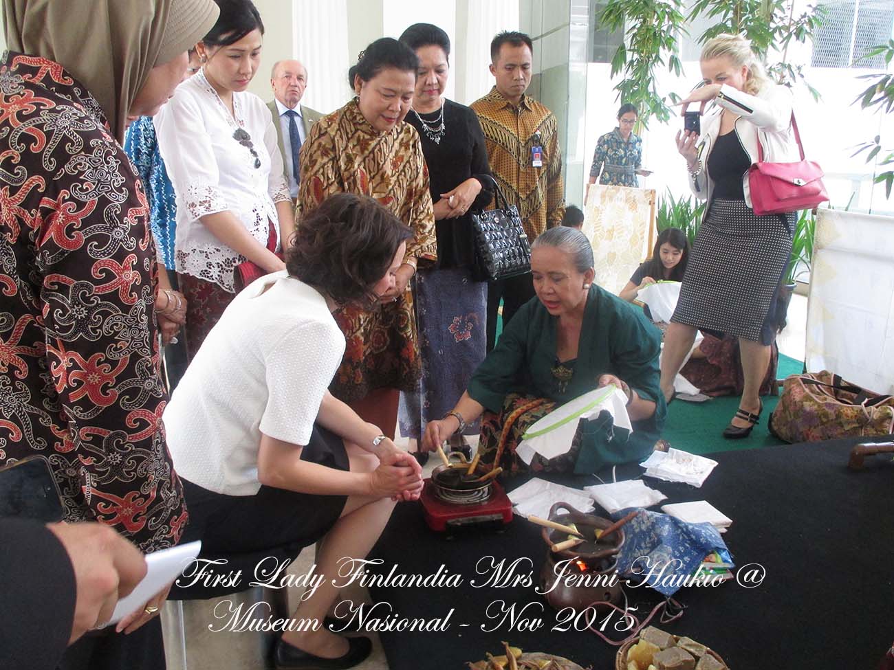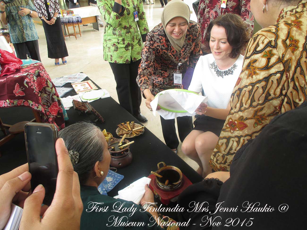 The First Lady of Finland interested in making BATIK @ Indonesia National Museum Wednesday, November 4, 2015 @ Indonesia National Museum The First Lady of Finland, Mrs Jenni Haukio interested in making hand-written Batik with Mrs Indra Tjahjani. Share this: Click to share on Facebook (Opens in new window) Facebook Click to share on X (Opens in new window) X Click to share on LinkedIn (Opens in new window) LinkedIn Like Loading... Related