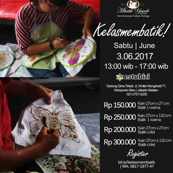 NGABUBURIT SAMBIL MEMBATIK COLET YUUUK @ ESTUBIZI 3 JUNI 2017 NGABUBURIT SAMBIL MEMBATIK COLET YUUUK @ ESTUBIZI 3 JUNI 2017 SILAKAN REGISTRASI via WA 0817 1977 47 dengan Bu Indra Tjahjani Share this: Share on Facebook (Opens in new window) Facebook Share on X (Opens in new window) X Share on LinkedIn (Opens in new window) LinkedIn Like Loading... Related