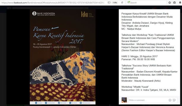 BATIK WORKSHOP with DR.Ir. INDRA TJAHJANI at KARYA KREATIF INDONESIA 2017 – BANK INDONESIA CENDRAWASIH ROOM – JCC – 20 AGUSTUS 2017 Share this: Click to share on Facebook (Opens in new window) Facebook Click to share on X (Opens in new window) X Click to share on LinkedIn (Opens in new window) LinkedIn Like Loading... Related