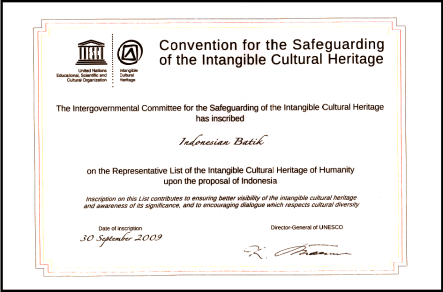 UNESCO memberikan pengakuannya untuk BATIK INDONESIA, sebagai WARISAN BUDAYA TAK BENDA (INTANGIBLE HERITAGE), karena BATIK INDONESIA berhubungan TRADISI (terutama) MASYARAKAT JAWA, misalnya : BATIK berhubungan siklus hidup manusia, sejak dilahirkan, sakit, menikah, upacara kehamilan 7 bukan, meninggal dll.