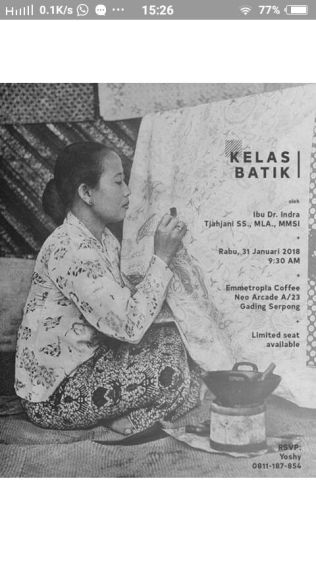 ‘GRIYA PENI – MBATIKYUUUK’ pada tanggal 3 Januari 2018, memperoleh UNDANGAN dari Mbak Yoshy Mutiart untuk berbagi tentang BATIK di EMMETROPIA COFFEE di Gading Serpong,