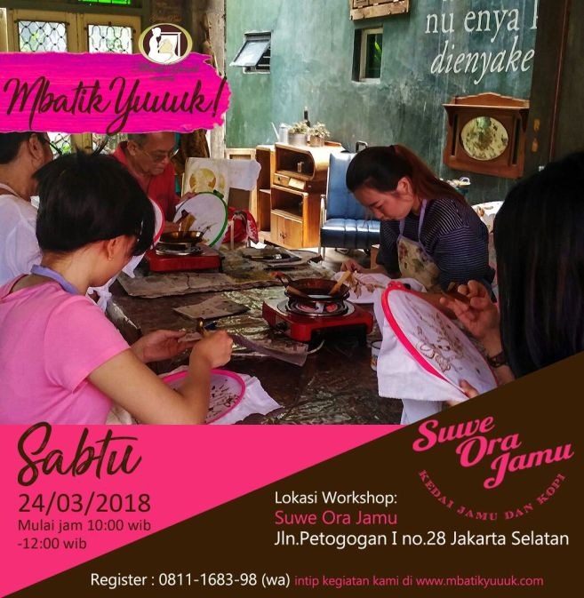 MARI MENGENAL BATIK & MEMBATIK 24 MARET 2017 di SUWE ORA JAMU CAFE MARI MENGENAL BATIK & MEMBATIK 24 MARET 2017 di SUWE ORA JAMU CAFE PLEASE Register via WA 0811 1683 98 Share this: Click to share on Facebook (Opens in new window) Facebook Click to share on X (Opens in new window) X Click to share on LinkedIn (Opens in new window) LinkedIn Like Loading... Related