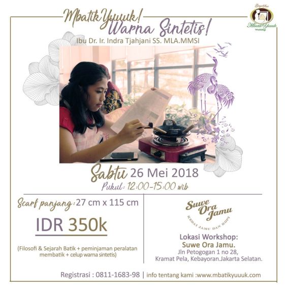 RAMADHAN BATIK WORKSHOP 26 MAY 2018 di JAKARTA SELATAN RAMADHAN BATIK WORKSHOP 26 MAY 2018 PLEASE REGISTER VIA WA 0811 1683 98 Share this: Click to share on Facebook (Opens in new window) Facebook Click to share on X (Opens in new window) X Click to share on LinkedIn (Opens in new window) LinkedIn Like Loading... Related