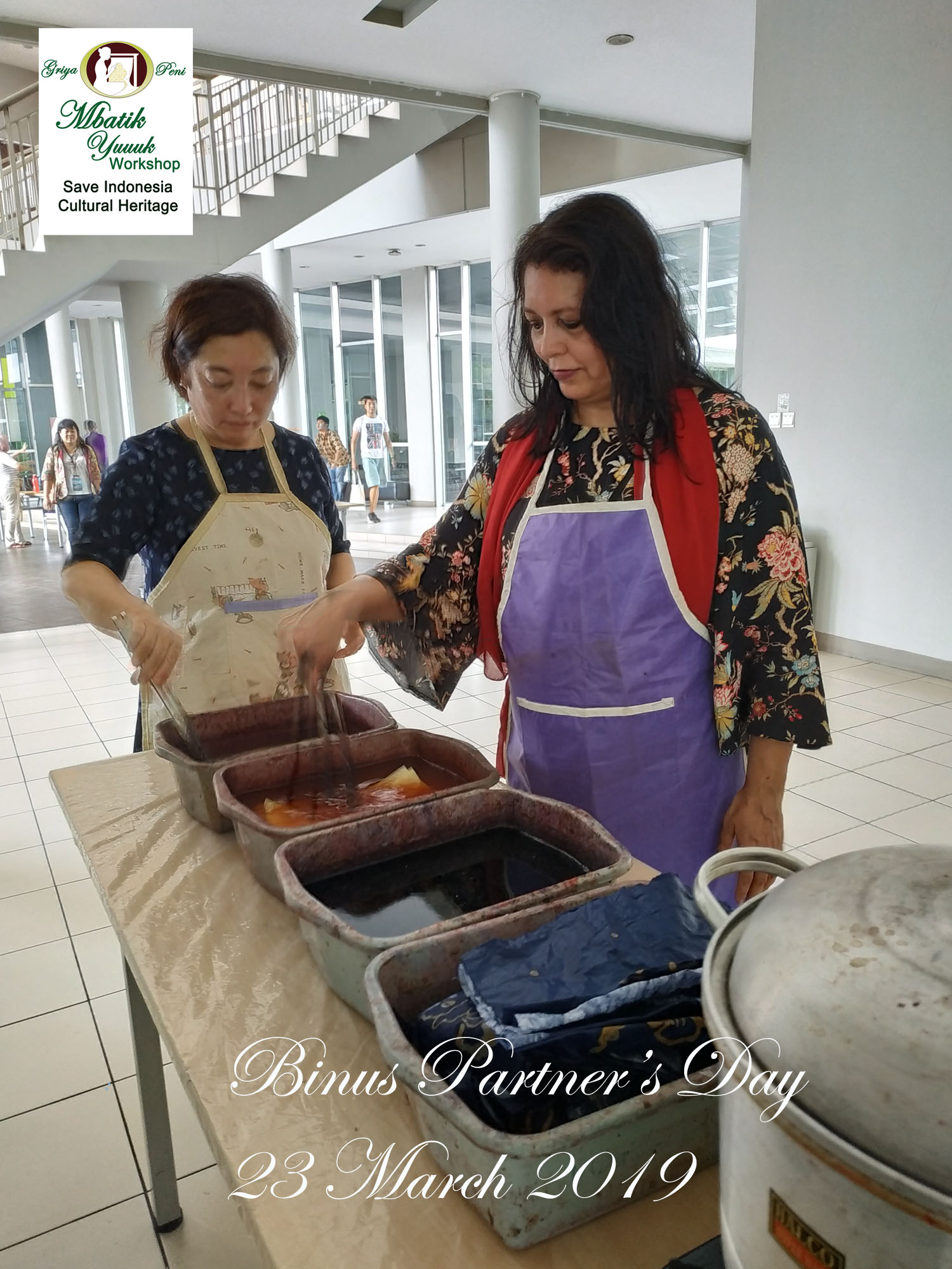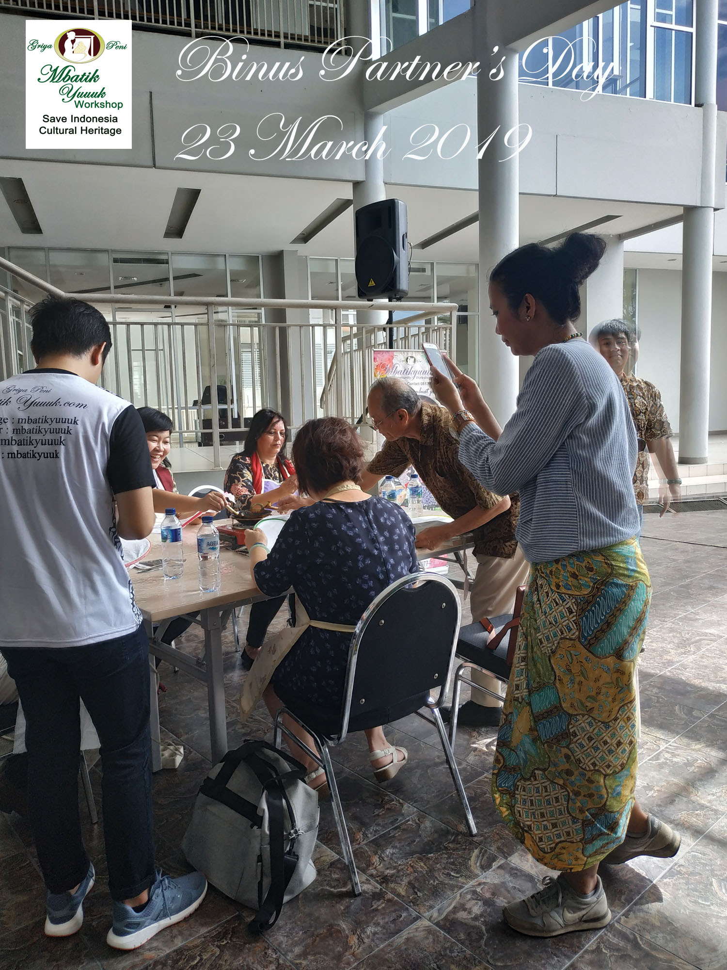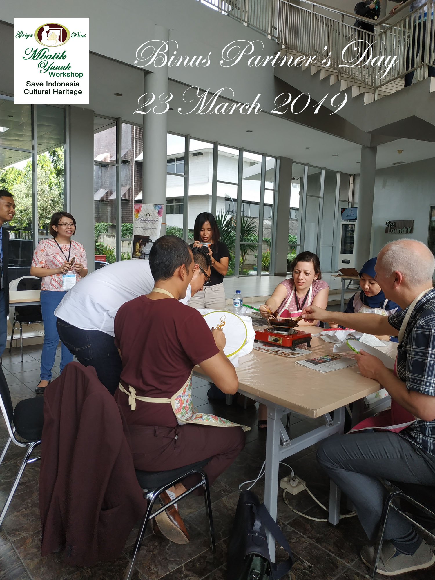 BINUS SQUARE : BATIK WORKSHOP 23 MARCH 2019 BINUS SQUARE was having BATIK WORKSHOP on 23 MARCH 2019 for INTERNATIONAL CEO EVERYBODY WITH THEIR OWN BATIK Share this: Click to share on Facebook (Opens in new window) Facebook Click to share on X (Opens in new window) X Click to share on LinkedIn (Opens in new window) LinkedIn Like Loading... Related
