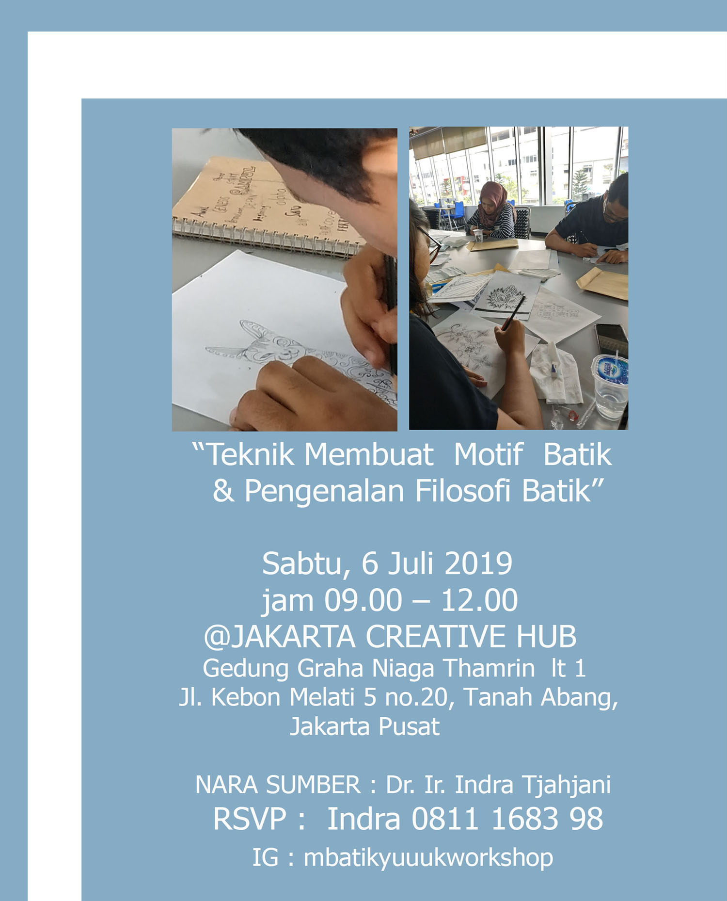 STEP BY STEP MEMBUAT MOTIF BATIK – 6 JULI 2019 STEP BY STEP MEMBUAT MOTIF BATIK & MENGENAL FILOSOFI DIBALIK RAGAM HIAS BATIK SABTU 6 JULI 2019 Jam 09.00-12.00 di JAKARTA CREATIVE HUB – GEDUNG GRHA NIAGA THAMRIN lantai I, Jl. Kebon Melati 5 no 20, JAKARTA PUSAT Share this: Click to share on Facebook (Opens in new window) Facebook Click to share on X (Opens in new window) X Click to share on LinkedIn (Opens in new window) LinkedIn Like Loading... Related