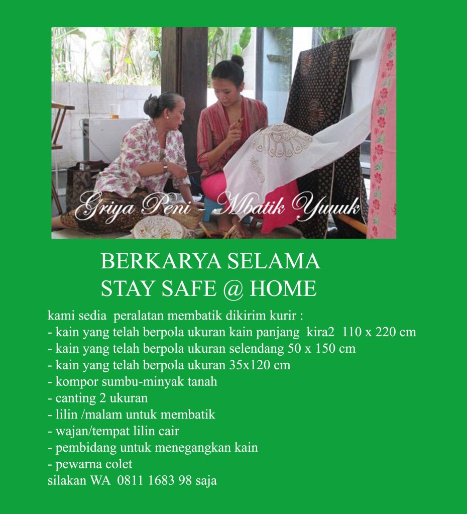 MEMBUAT BATIK saat STAY SAFE @HOME Halo SAHABAT-SAHABAT ayo isi hari-hari dengan membuat BATIK sendiri, kami sediakan peralatannya, dan mas kurir mengirimkan kerumah sahabat, tanpa harus keluar rumah…..Yuuuk Mbatik Yuuuk Share this: Click to share on Facebook (Opens in new window) Facebook Click to share on X (Opens in new window) X Click to share on LinkedIn (Opens in new window) LinkedIn Like Loading... Related