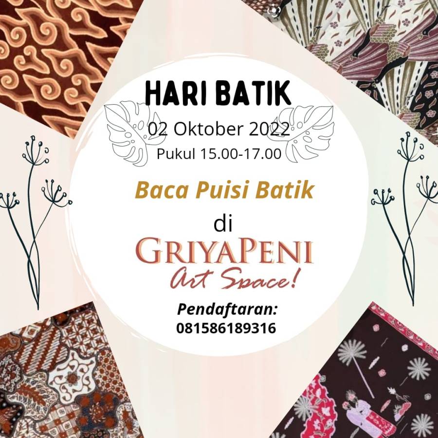Dalam Rangka Memperingati Bulan Batik Nasional, Griya Peni Art Space akan ada serangkaian acara , yang akan diawali dengan Pembacaan Puisi oleh Sahabat2 Ibu Dr. Ir. Indra Tjahjani. Diantaranya Mas Kurnia Effendi.