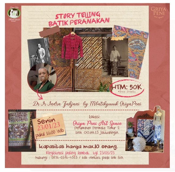 STORY TELLING BATIK PERANAKAN @ GRIYA PENI ART SPACE Dalam Rangka Menyambut Tahun Baru IMLEK 2023 – kami mengadakan : STORY TELLING BATIK PERANAKAN @ GRIYA PENI ART SPACE 23 JANUARI 2023 – JAM 16.00 PLEASE COME & JOIN , Share this: Click to share on Facebook (Opens in new window) Facebook Click to share on X (Opens in new window) X Click to share on LinkedIn (Opens in new window) LinkedIn Like Loading... Related