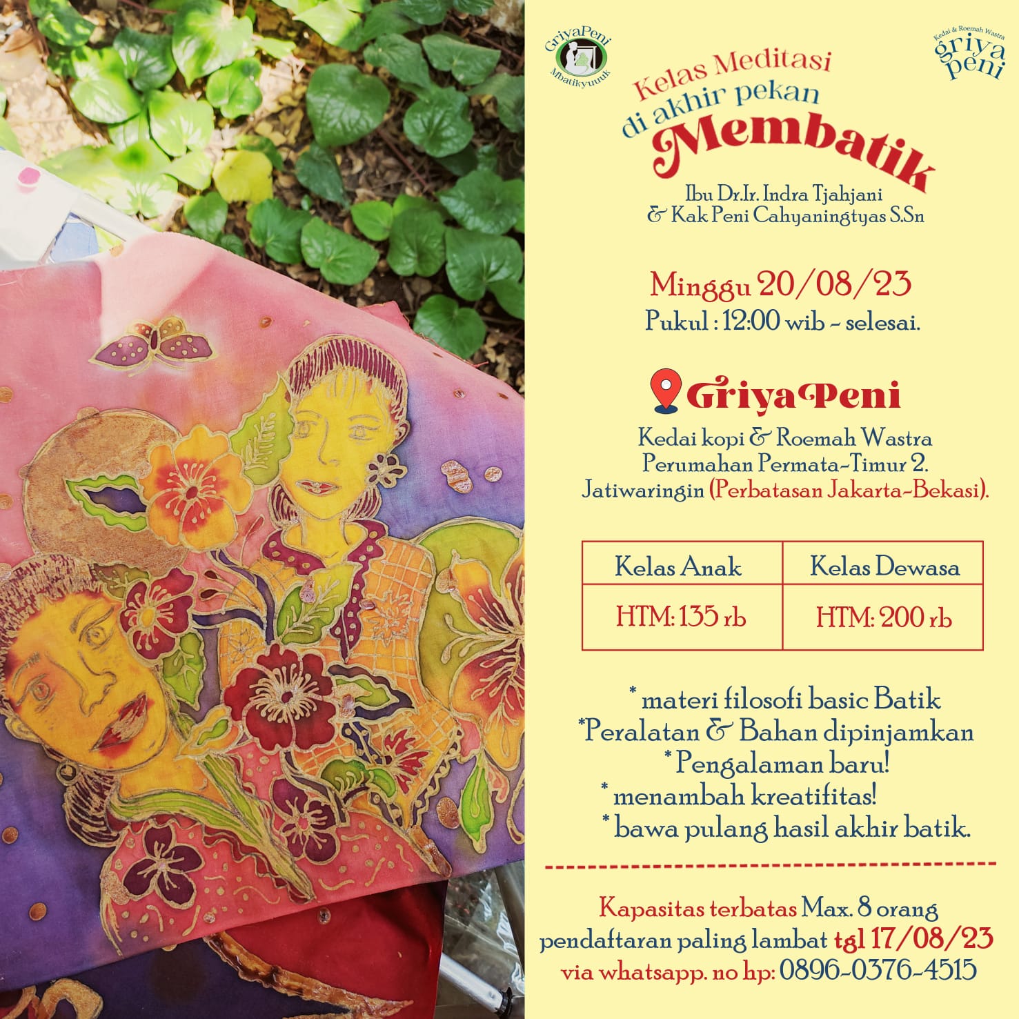 Halo Sahabat-sahabat Griya Peni – Mbatik Yuuuk dalam rangka memperingati Ulang Tahun Kemerdekaan Republik Indonesia yang ke 78 Tahun, kami mengundang Sahabat – sahabat untuk ber’Meditasi’ melalui Membatik WARNA – WARNI.