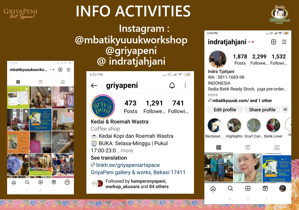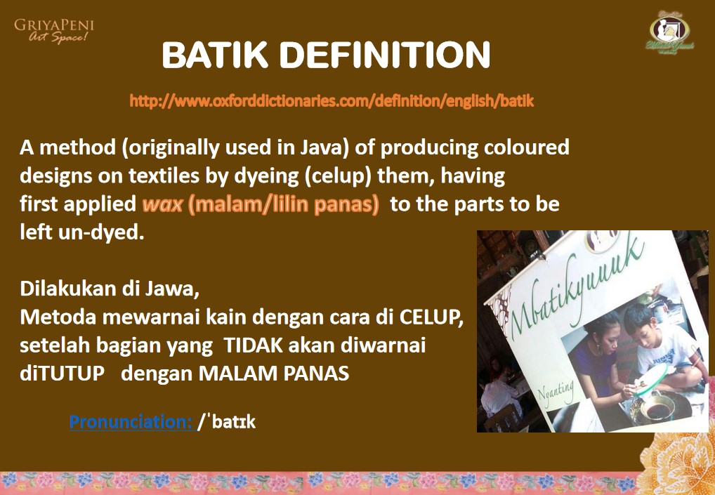 Before we start the Batik workshop, Ibu Dr.Ir. Indra Tjahjani share about the back ground of establishing Griya Peni – Mbatikyuuuk, Batik definition, Batik History from the past up to now and Batik Philosophy behind each Batik.