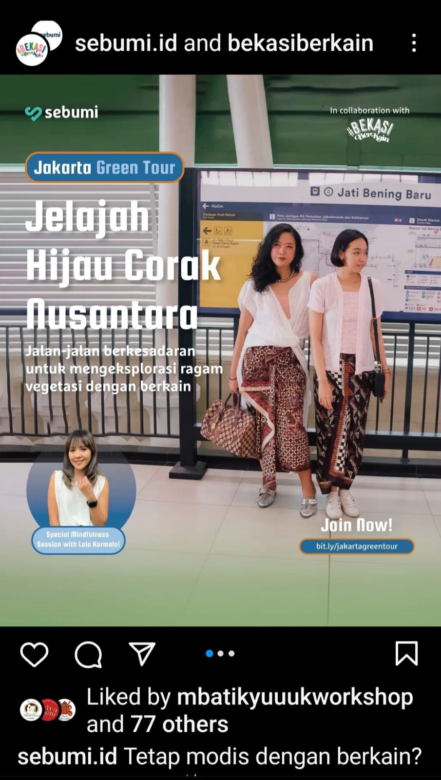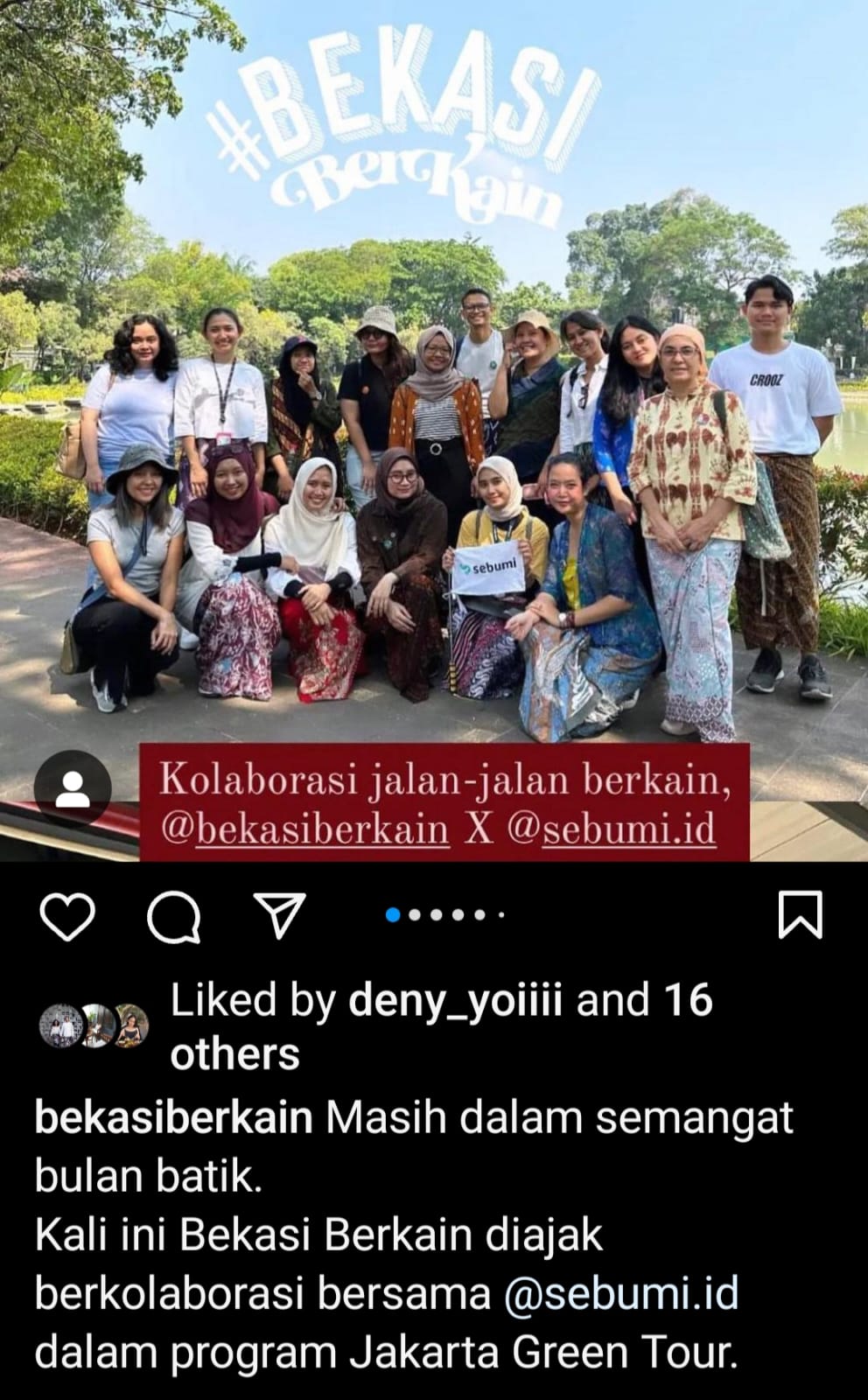 SEBUMI dengan mengusung tema Jelajah Hijau Corak Nusantara, bekerja sama dengan Bekasi Berkain – Griya Peni pada tanggal 28 Oktober 2023 mengadakan acara Jalan-jalan berkesadaran untuk mengeksplorasi ragam vegetasi dengan berkain.
