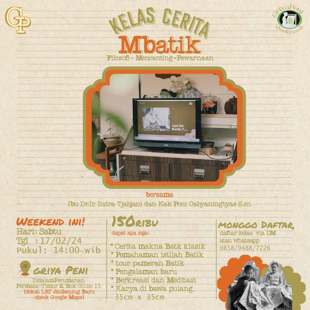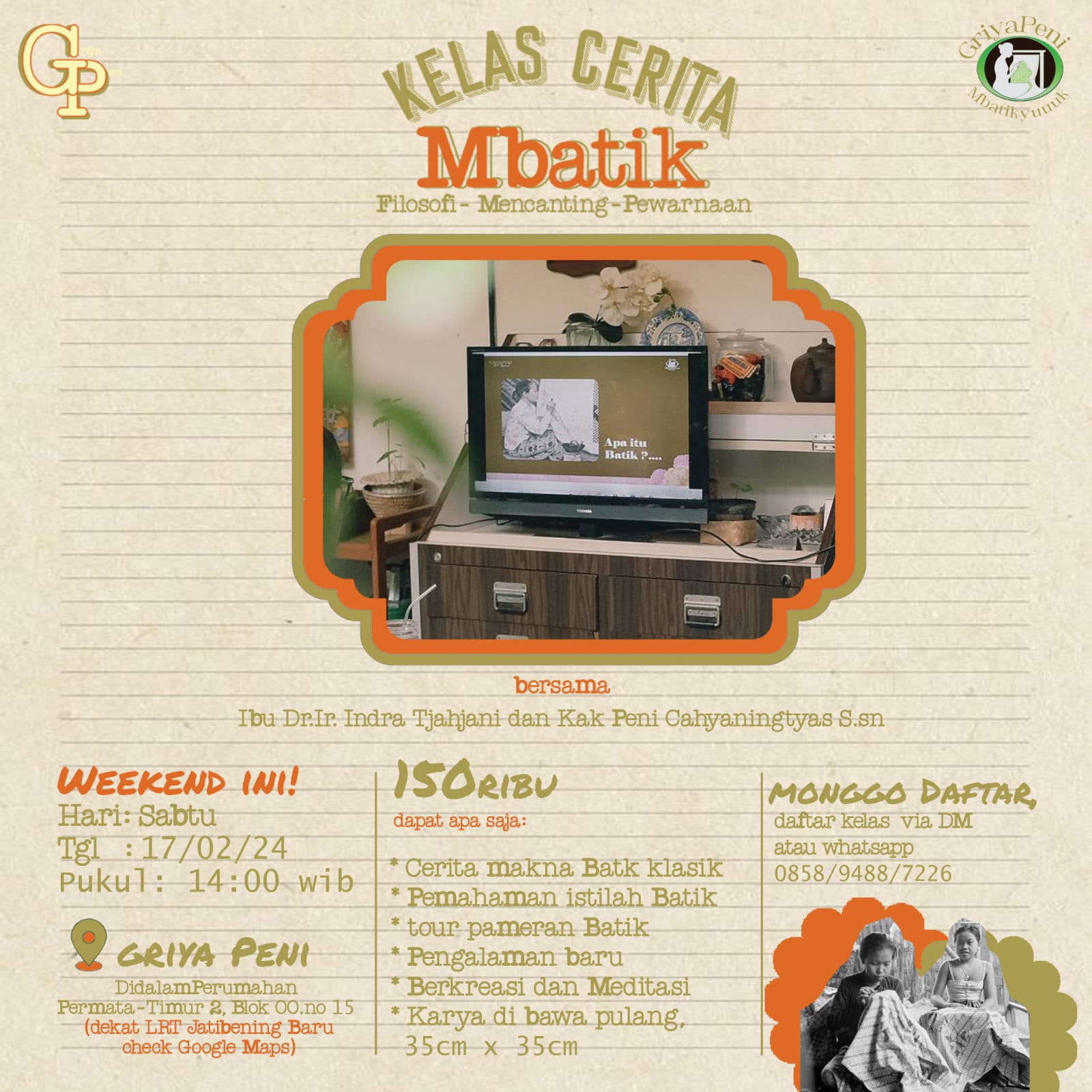WORKSHOP MEMBATIK 17 FEB 24 – dg Bu Indra & Kak Peni WORKSHOP MEMBATIK & STORY TELLING seputar BATIK, SILAKAN hubungi via WA saja 0858 9488 7226 atau 0811 1683 98 di tunggu ya Share this: Click to share on Facebook (Opens in new window) Facebook Click to share on X (Opens in new window) X Click to share on LinkedIn (Opens in new window) LinkedIn Like Loading... Related
