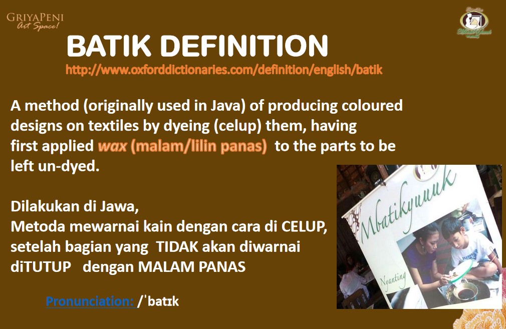Sahabat-sahabat ingatnya, yang disebut Batik, adalah suatu proses pemberian warna pada kain, dengan cara di CELUP. dimana motif yang ingin kita buat telah dirintangi dengan MALAM PANAS.
