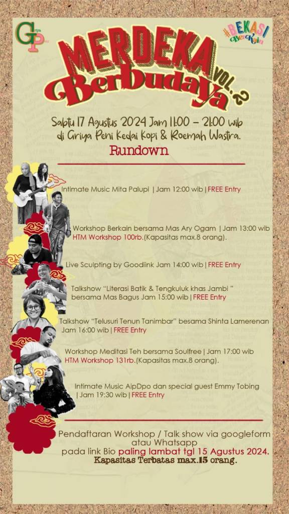 Dalam rangka memperingati hari Kemerdekaan Republik Indonesia yang ke 79 tahun, Griya Peni – Mbatik Yuuuk bersama Bekasi Berkain mengadakan acara : MERDEKA BERBUDAYA – Terbuka untuk umum : FREE ENTRY.