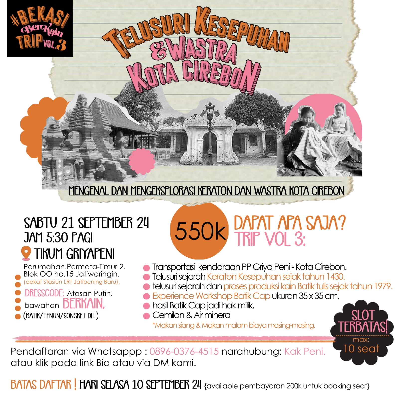 CULTURE TRIP TO CIREBON 21 SEPTEMBER 2024 Hai guys, let;s join our Culture Trip to Cirebon, limited seats Share this: Share on Facebook (Opens in new window) Facebook Share on X (Opens in new window) X Share on LinkedIn (Opens in new window) LinkedIn Like Loading... Related