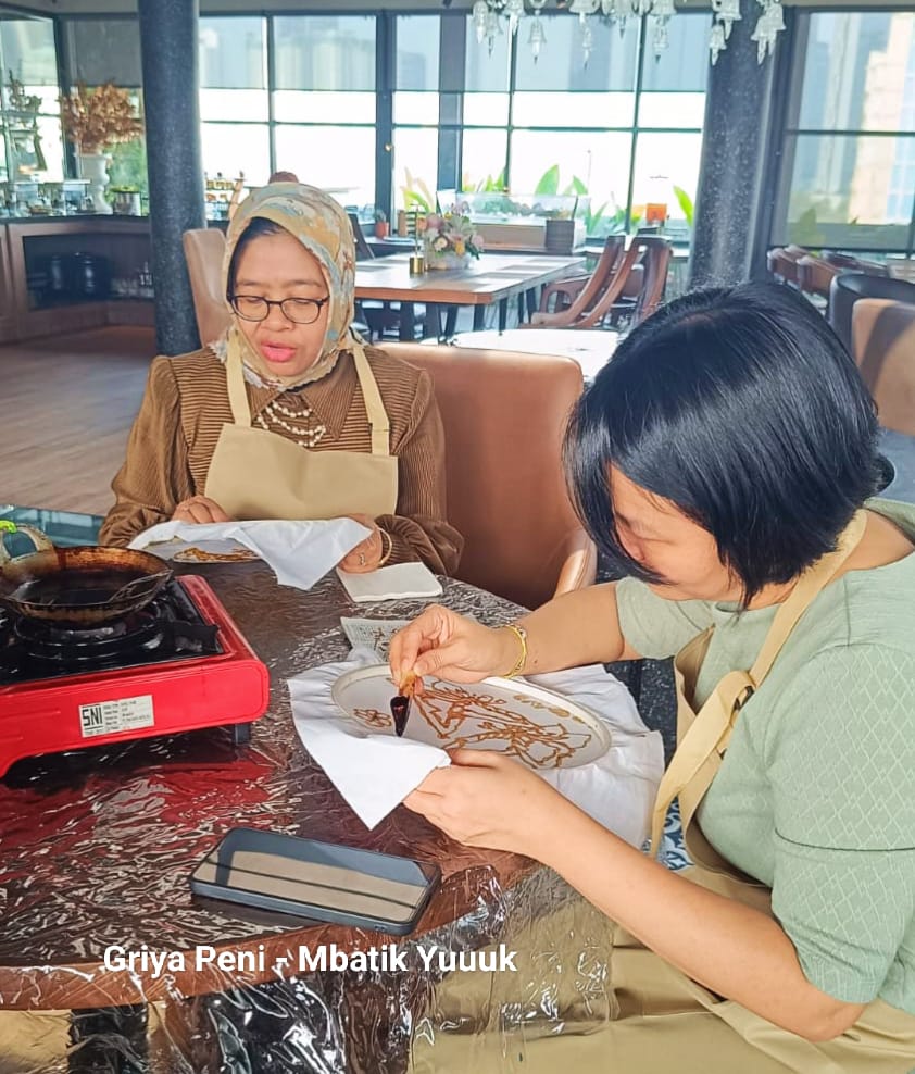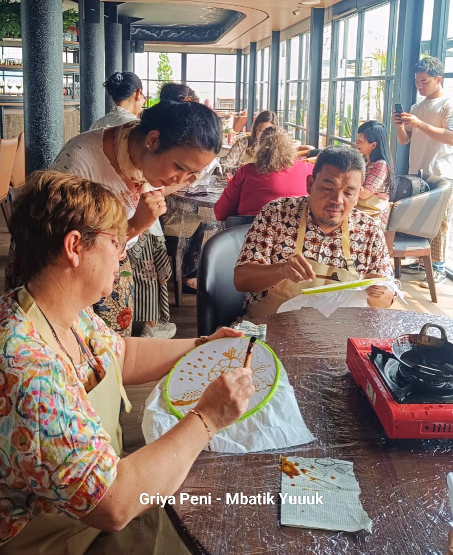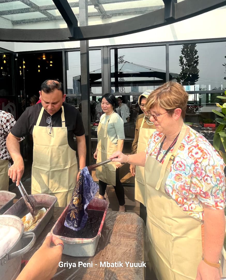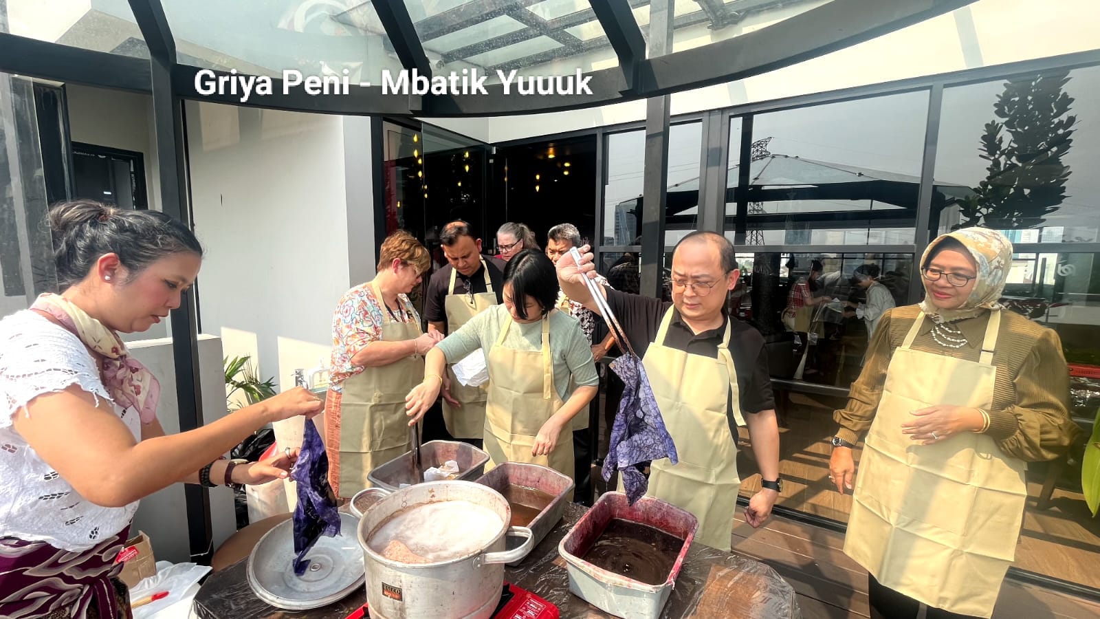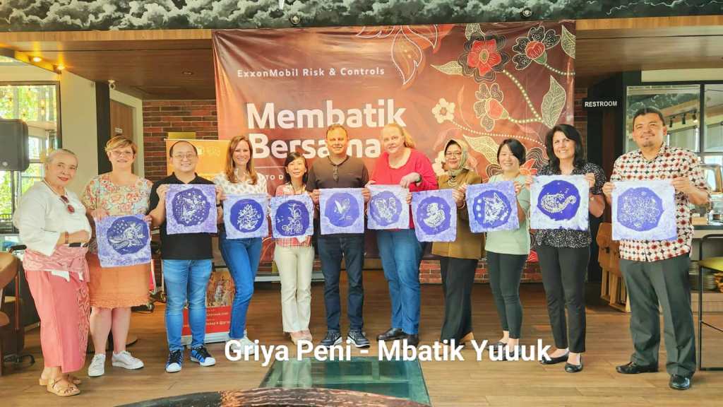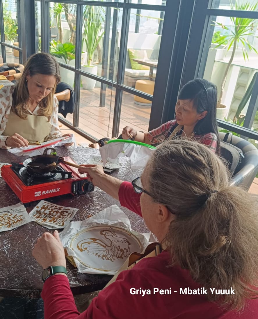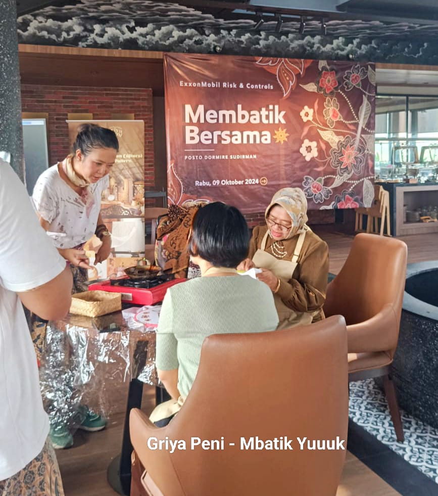 October 9, 2024 Mrs Indra Tjahjani & Mrs Peni Cahyaningtyas are introducing how to make traditional Batik to some expert of ExxonMobil Risk & Controls at Posto Domire Hotel Sudirman, Jakarta, Indonesia