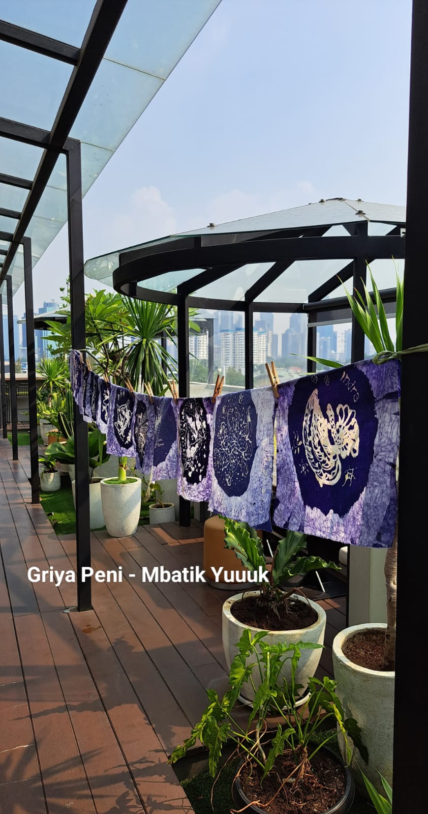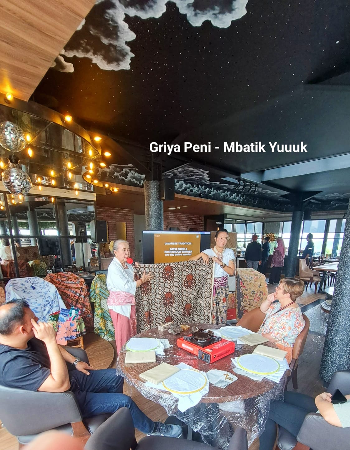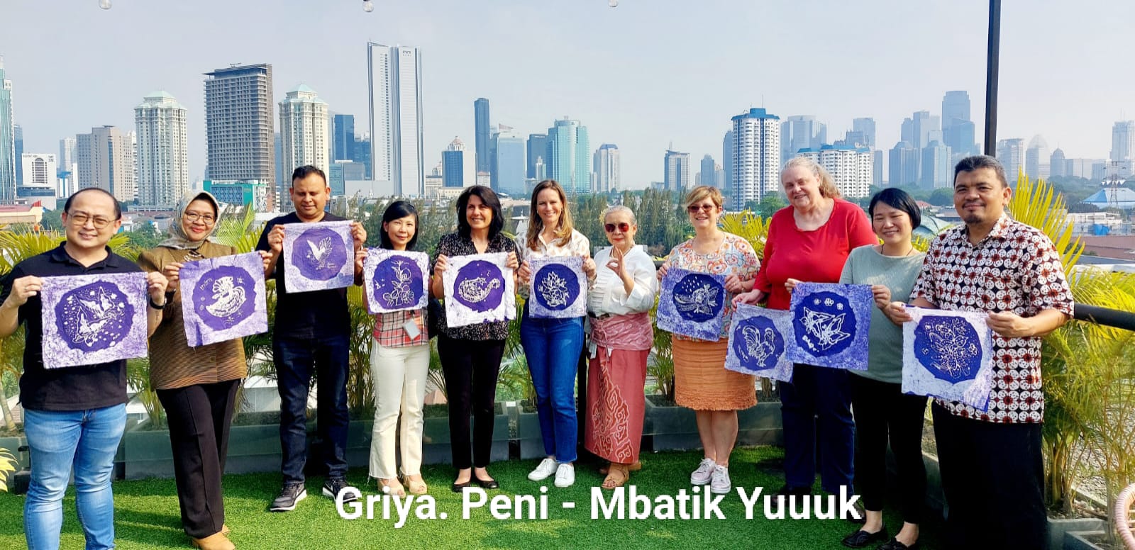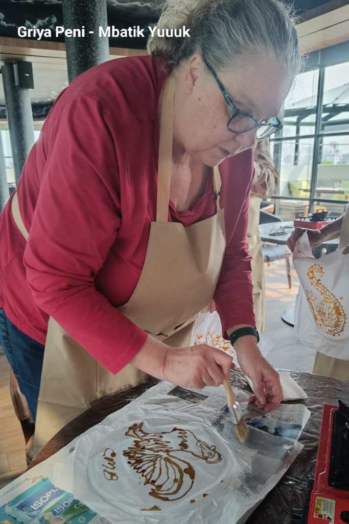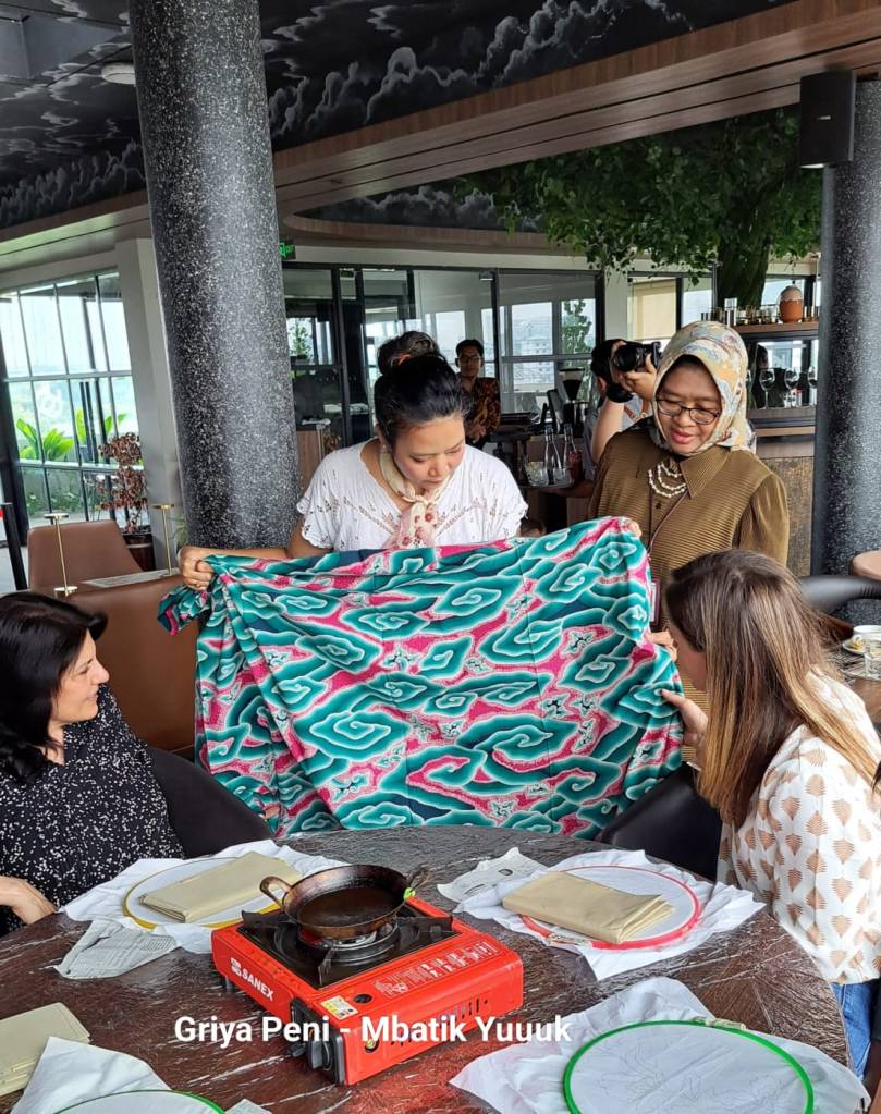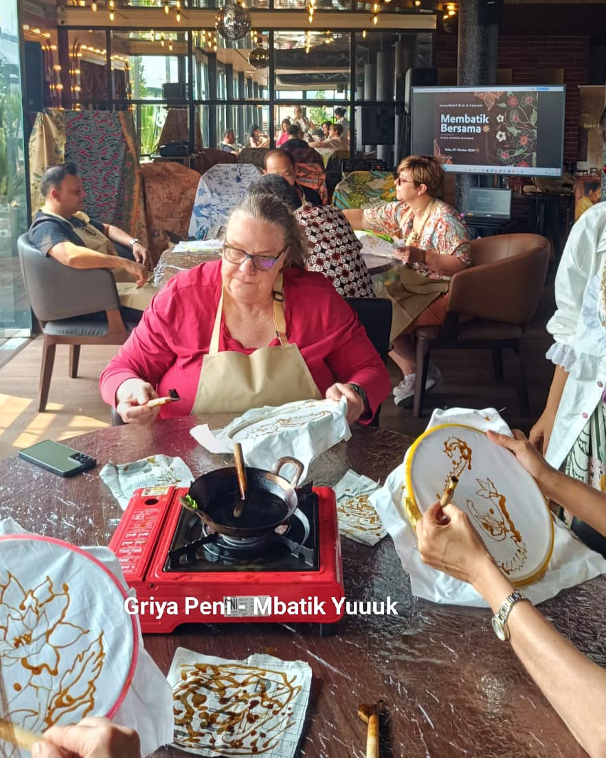 October 9, 2024 Mrs Indra Tjahjani & Mrs Peni Cahyaningtyas are introducing how to make traditional Batik to some expert of ExxonMobil Risk & Controls at Posto Domire Hotel Sudirman, Jakarta, Indonesia