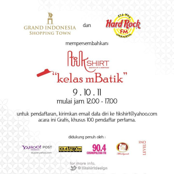 – GRAND INDONESIA & HARD ROCK FM mempersembahkan TIKSHIRT yg di dukung oleh @mbatikyuuuk mempersembahkan KELAS MBATIK. – okt 2011